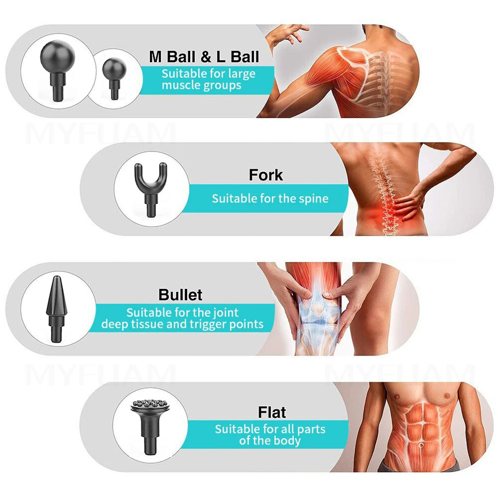 Notre masseur musculaire propose 4 types de têtes de massage pour répondre aux besoins des différentes parties nécessaires au massage. La tête de massage peut être retirée pour une installation et un nettoyage faciles.