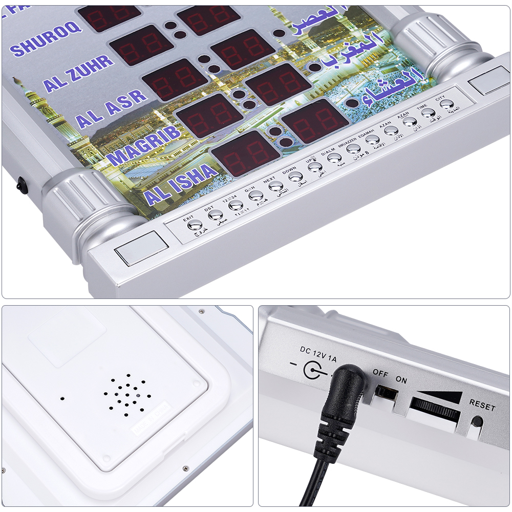 Caractéristiques:-Azan complet pour toutes les prières (avec contrôle du volume)-Alarmes de prière pour rappeler toutes les prières à lqamah ou salat-Temps de prière pour la plupart des villes du monde, avec système azan taqweem-Pourrait être utilisé facilement selon le code téléphonique international en particulier dans al-harameen-Pourrait modifier facilement les différents temps de prière dans les banquets des villes-La possibilité d’allumer ou d’éteindre le son azan séparément-Affichage de la température, calendrier hijri et grégorien-Option d’heure d’été, lumière plein écran-Commutateur de contrôle du Volume, prise cc pour l’alimentation