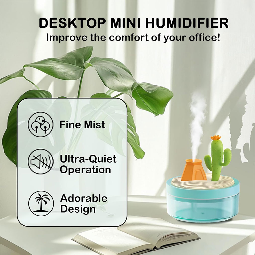 مرطب الهواء هذا يأتي بحجم مثالي (12.4 × 12.4 × 13.5 سم) ليكون إضافة رائعة على مكتبك أو في غرفتك.