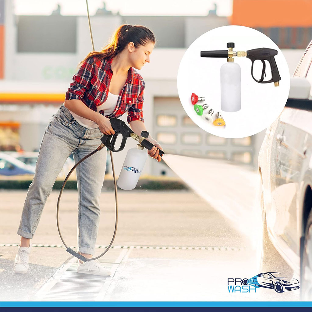 LE KIT DE LAVAGE AUTO ULTIME – Ce kit de lavage auto haute pression étanche avec pistolet/mousseur et flacon de lavage est indispensable pour votre nettoyeur haute pression. Le raccord rapide 1/4″ et le raccord interne métrique M22-14 mm se connectent facilement à un tuyau de nettoyeur haute pression M22.Facile à utiliser et à installer, ce pistolet à mousse avec flacon de savon et 5 buses de lavage interchangeables est facile à prendre en main et répond à tous vos besoins de lavage haute pression. Nettoyer sa voiture n’a jamais été aussi simple grâce à ces accessoires de lavage.De l’arrosage des plantes à l’élimination des taches les plus tenaces, 5 buses de 0° à 60° permettent de contrôler le jet, de la pointe crayon au jet éventail, et ainsi de maîtriser la pression. Idéal pour atteindre les endroits les plus difficiles d’accès, notamment les allées, les terrasses, les toits, les bardages et les véhicules.POUR LES PROFESSIONNELS OU LES AMATEURS – Le jet d’eau haute pression, combiné au détergent et à l’air, produit une mousse épaisse qui adhère à la surface à nettoyer. Cela permet au produit nettoyant d’agir plus longtemps sur les particules de saleté et de les éliminer plus efficacement, pour un résultat optimal à chaque fois.