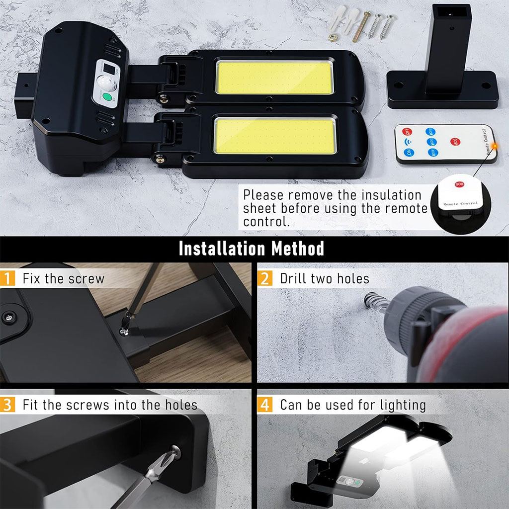 【Lampadaire super lumineux】 Les lampes solaires à mouvement extérieur sont fabriquées en ABS + PC à fort impact, équipées de 200 perles de lampe LED, à faible consommation d'énergie. Les appliques murales peuvent fournir un éclairage ultra-haute luminosité pour une grande surface.【3 modes d'éclairage et télécommande】Mode 1 : allume automatiquement la haute luminosité lorsqu'un mouvement est détecté et devient une luminosité moyenne après 20 secondes.Mode 2 : allume automatiquement la haute luminosité lorsqu'un mouvement est détecté et s'éteint après 20 secondes.Mode 3 : éclairage constant dans l'obscurité.Vous pouvez également utiliser la télécommande pour régler le mode de votre choix.【Tête d'éclairage réglable et éclairage grand angle】Les lampes solaires de stationnement peuvent être tournées de haut en bas à 90 °, à gauche et à droite à 180 °, une lumière peut être utilisée comme deux. Les appliques murales de sécurité peuvent être sensibles aux objets se déplaçant à moins de 240 °.【Panneaux solaires étanches et efficaces IP65】Le lampadaire solaire a des performances d'étanchéité IP65 et peut être utilisé dans divers environnements extérieurs et conditions météorologiques extrêmes. Le lampadaire LED utilise des panneaux solaires en polysilicium, se chargeant pendant 6 à 8 heures et peut durer 8 à 10 heures.【Service de vente et installation】Si vous avez des problèmes, veuillez nous contacter. Nous le traiterons dans les 24 heures. Les lampadaires sans fil peuvent être facilement installés et peuvent être montés directement sur le mur et le poteau avec les vis fournies.