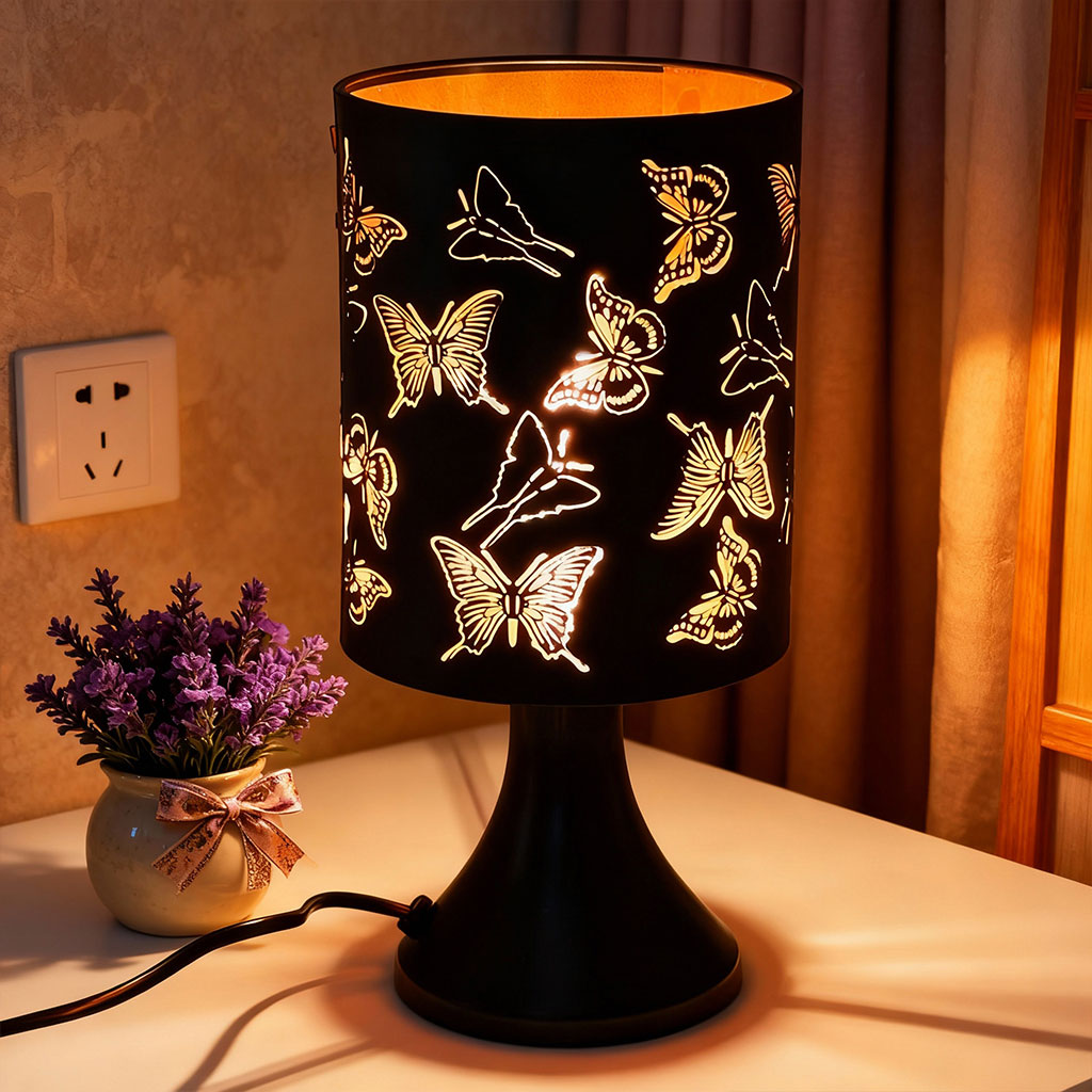 أضف لمسة شاعرية إلى ديكور منزلك مع هذه المصباحة الزخرفية الأنيقة، المزودة بظلّ أسود منقوش برسومات فراشات مضيئة 🦋.
