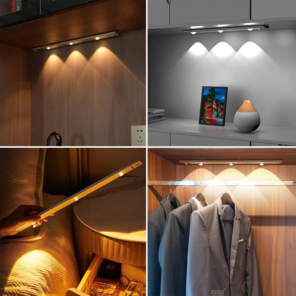 【Innovante Conception de L’éclairage】Avec des billes LED innovantes à “effet de colline”, l’éclairage d’armoire LED commandé par capteur émet un faisceau lumineux arqué qui recrée le contour d’une colline. En fonction du lieu d’installation, la lampe led sans fil produit des effets d’éclairage complexes et uniques.【3 Couleurs et Luminosité Réglable】La lumiere detecteur de mouvement interieur offre 3 options de température de couleur, vous pouvez commuter le bouton pour commuter le blanc chaud (3000K), le blanc neutre (4500K), le blanc froid (6500K). La fonction de gradation continue vous permet d’ajuster la luminosité de 5% à 100% (100-300 lumens) selon vos besoins.【3 Modes pour Différents Besoins】Notre veilleuse detecteur de mouvement dispose de trois modes pour répondre à des besoins différents: ①Mode capteur de mouvement : il s’allume automatiquement lorsqu’un mouvement humain dans un rayon de 3 mètres/120° est détecté dans un environnement sombre et s’éteint après 25 secondes.② Mode toujours allumé : peut être utilisé comme lampe de poche.③ Mode éteint.Les 3 modes répondent à vos différents besoins.【Haute Capacité de La Batterie 800mAh】Cette led cuisine est équipée d’une batterie rechargeable de haute capacité de 800mAh, qui peut être facilement rechargée en 3 heures via un câble USB. Après avoir été complètement rechargées, ces lampes peuvent fonctionner jusqu’à 6-10 heures en mode toujours allumé et pendant 1-2 mois en mode capteur de mouvement. Le port de charge de type C rend la recharge plus pratique.【Easy Installation】Grâce aux puissants aimants incorporés aux deux extrémités, il peut être fixé à n’importe quelle surface en fer. Vous pouvez également utiliser la feuille de fer incluse pour le fixer à toute surface non ferreuse. Les lampes à détecteur de mouvement d’intérieur conviennent à la cuisine, à l’armoire, à la garde-robe, à la chambre à coucher, à la salle de bain, à l’étagère, au garage, au couloir, aux escaliers, etc.