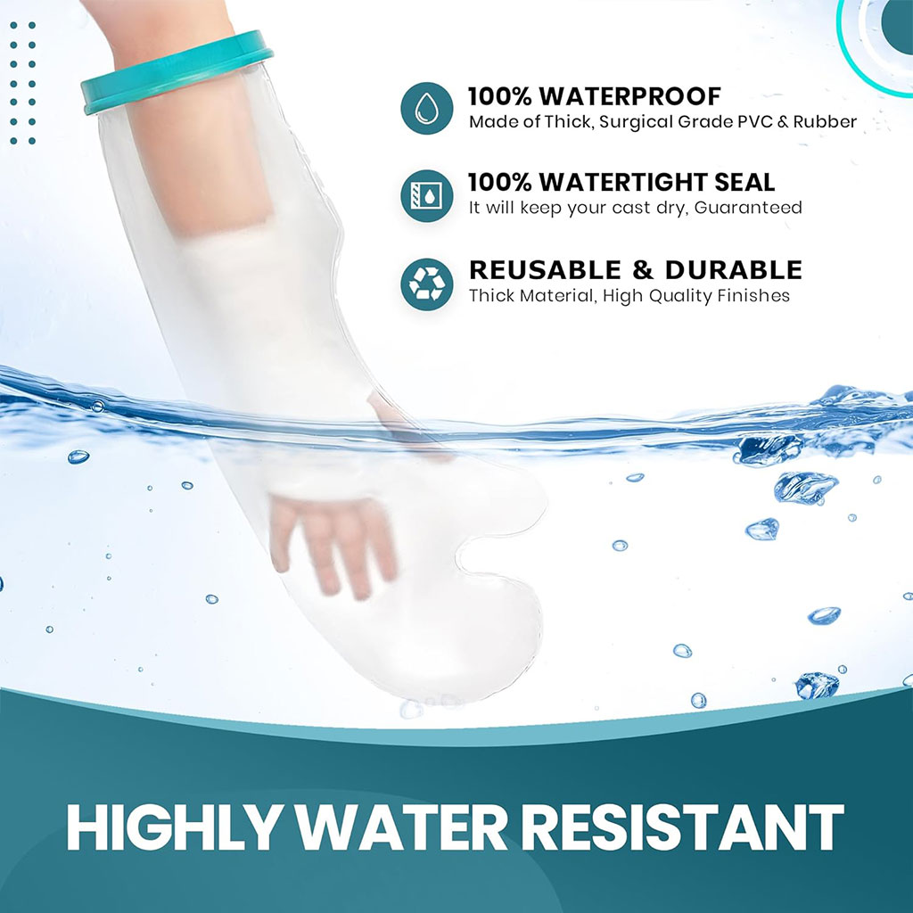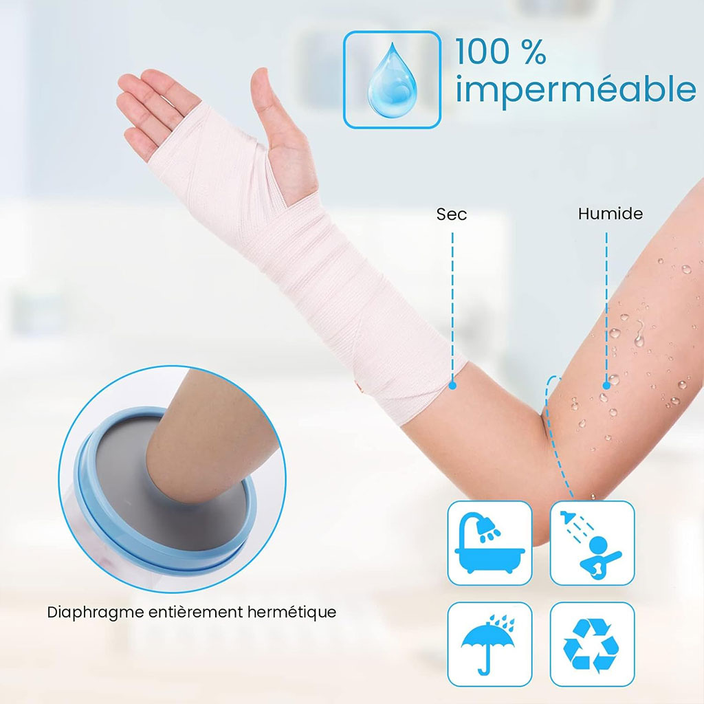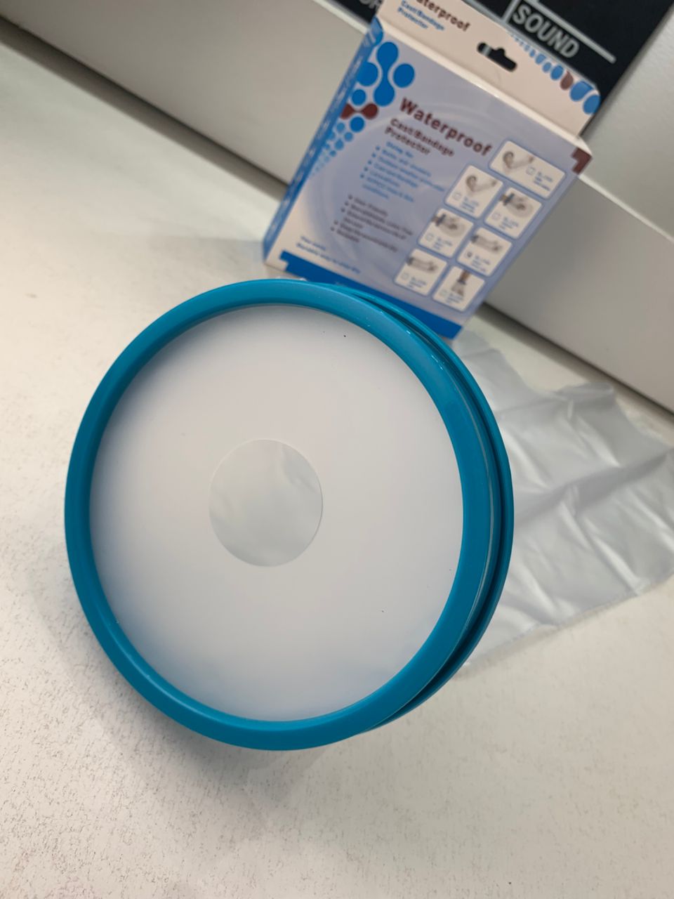 الغطاء مقاوم للماء بنسبة 100% لحماية الجزء المصاب. يمنع بشكل فعّال تسرب الماء إلى المنطقة المتأثرة أثناء الاستحمام أو الأنشطة المائية الأخرى. مناسب للمرضى الذين لديهم قسطرة (PICC line)، ضمادات أو مشاكل جلدية.
