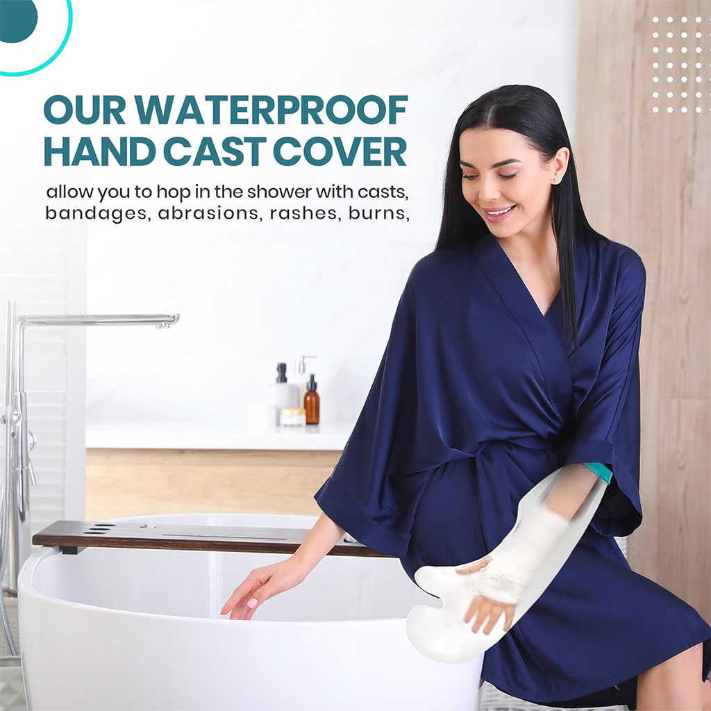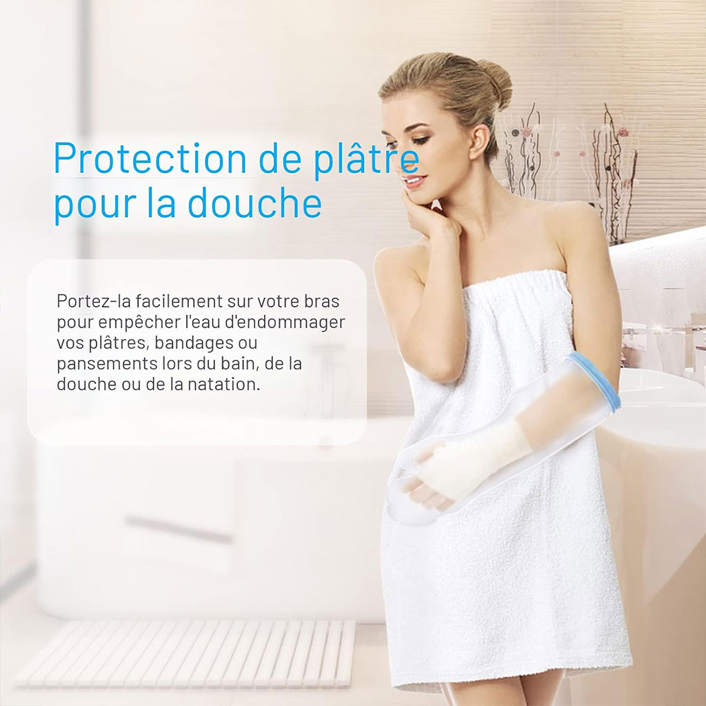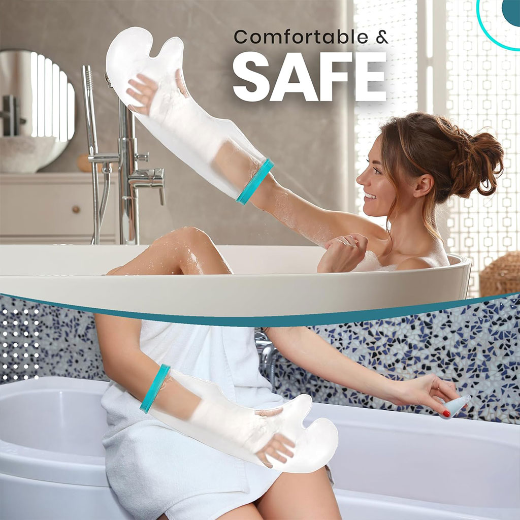الغطاء مقاوم للماء بنسبة 100% لحماية الجزء المصاب. يمنع بشكل فعّال تسرب الماء إلى المنطقة المتأثرة أثناء الاستحمام أو الأنشطة المائية الأخرى. مناسب للمرضى الذين لديهم قسطرة (PICC line)، ضمادات أو مشاكل جلدية.