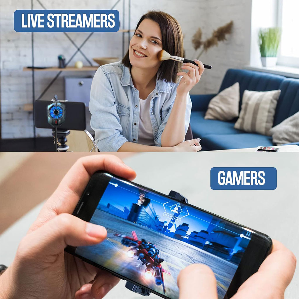 Ce que ce radiateur peut vous offrir, c’est qu’il a non seulement un turboréacteur puissant intégré pour refroidir rapidement votre téléphone, mais aussi qu’il est silencieux, n’interfère pas avec l’utilisation du téléphone.Avec la prise en charge de 2 niveaux de réglage, ce refroidisseur répondra aux besoins de votre téléphone pour différents niveaux de dissipation de chaleur. Et c’est une conception de pince, facile à installer et pratique à utiliser.Il est fabriqué en PC, aluminium et silicone de haute qualité.La longueur de ce produit est de 8cm et la largeur est de 6cm.Il convient aux téléphones de 4.0 à 6.7 pouces.Nom de l’article: Ventilateur de refroidissement