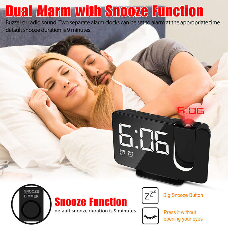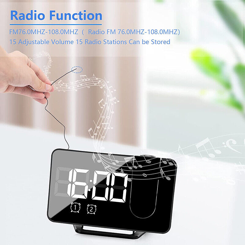 Réveil à projection HD 7 pouces : le réveil dispose d’un nouveau projecteur réglable qui offre une projection ultra-claire sur le mur ou le plafond. En plus de la luminosité de l’écran LED réglable, la luminosité de la projection peut également être ajustée et la projection rotative à 180° permet de connaître facilement l’heure sans avoir à se lever. Luminosité de projection à 2 niveaux (OFF-Légèrement lumineux-Haute luminosité).Réveil multifonctionnel : il s’agit d’un nouveau réveil qui combine réveil, radio et projecteur. Heure (12H/24H), double réveil, volume réglable, radio, projection, port de chargement USB et mémoire de mise hors tension, minuteries, fonction snooze tout en un.Double alarme avec fonction Snooze : Buzzer ou son radio. Deux réveils distincts peuvent être réglés pour sonner à l’heure appropriée. la durée de répétition par défaut est de 9 minutes.Radio FM avec minuterie de sommeil : Total de 15 mémoires préréglées de stations FM. (FM : 76,0-108,0 MHz). Ajustez le temps de sommeil de 5, 15, 30, 45, 60, 75, 90 ou désactivé. Vous pouvez régler les volumes de 0 à 15 niveaux.Chargeur de téléphone USB et batterie de secours : équipé d’une sortie USB 5 V/1 A, ce réveil à projection est très pratique pour charger votre téléphone ou d’autres appareils. Avec la batterie de secours intégrée, vous n’avez pas besoin de réinitialiser l’heure/l’alarme/la radio après une panne de courant ou une déconnexion temporaire.