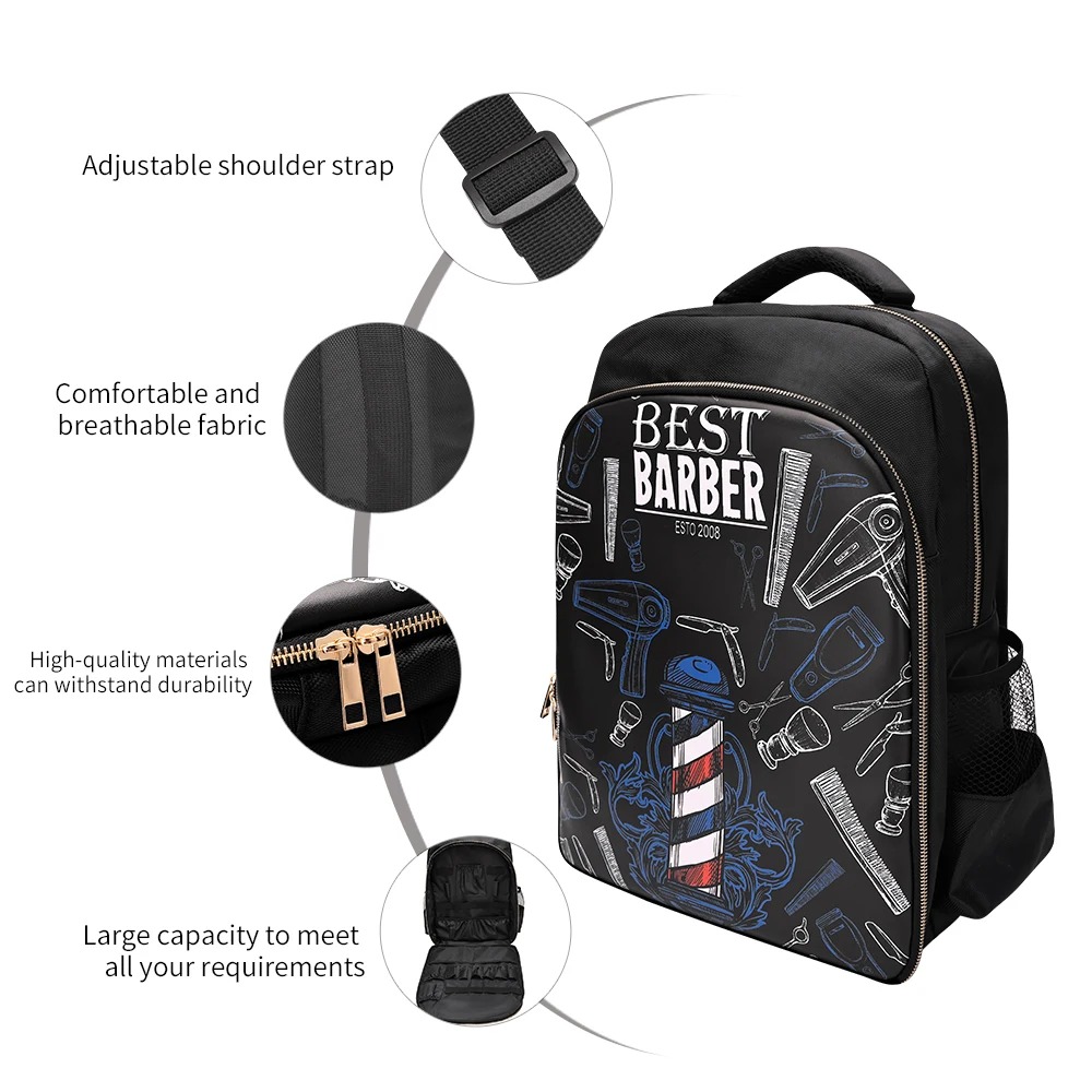 ⭐ المميزات الرئيسية :📦 سعة كبيرة : تتسع للمقصات، الأمشاط، الماكينات، مجفف الشعر، الفراشي، البخاخات وغيرها من الأدوات الكبيرة. الحل الأمثل لكل حلاق محترف.💎 مواد عالية الجودة : مصنوعة من نايلون متين مقاوم للتشوه، بلون أسود أنيق ومضاد للأوساخ. حزام الكتف قابل للتعديل لراحة أكبر.🌧️ مقاومة للماء : قماش بوليستر سميك ومشفر يحمي أدواتك من المطر أو أي تسرب مياه.🎒 راحة وتقليل الضغط : الظهر والأحزمة مبطّنة بإسفنج سميك + أحزمة عريضة تقلل الحمل على الكتفين والظهر، لتعطيك راحة في الحمل حتى مع الوزن الثقيل.👨🔧 متعددة الاستعمالات : مثالية للطلاب في مدارس الحلاقة، الحلاقين المبتدئين والمحترفين.📐 الأبعاد : 46 × 34 × 18 سم