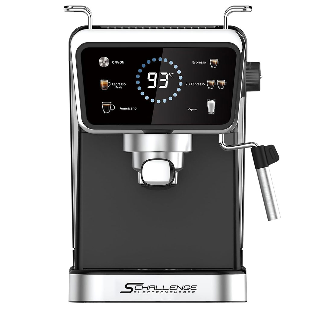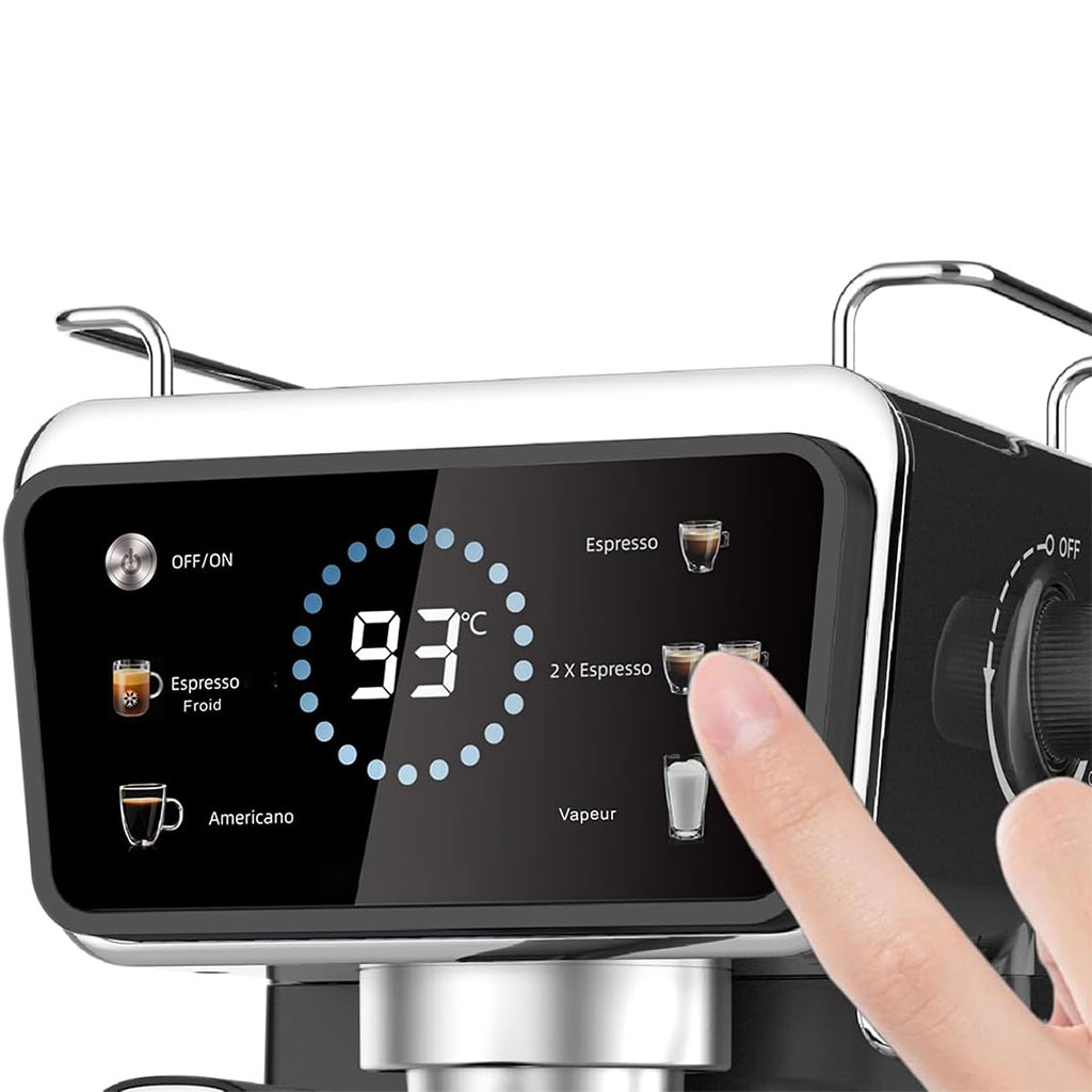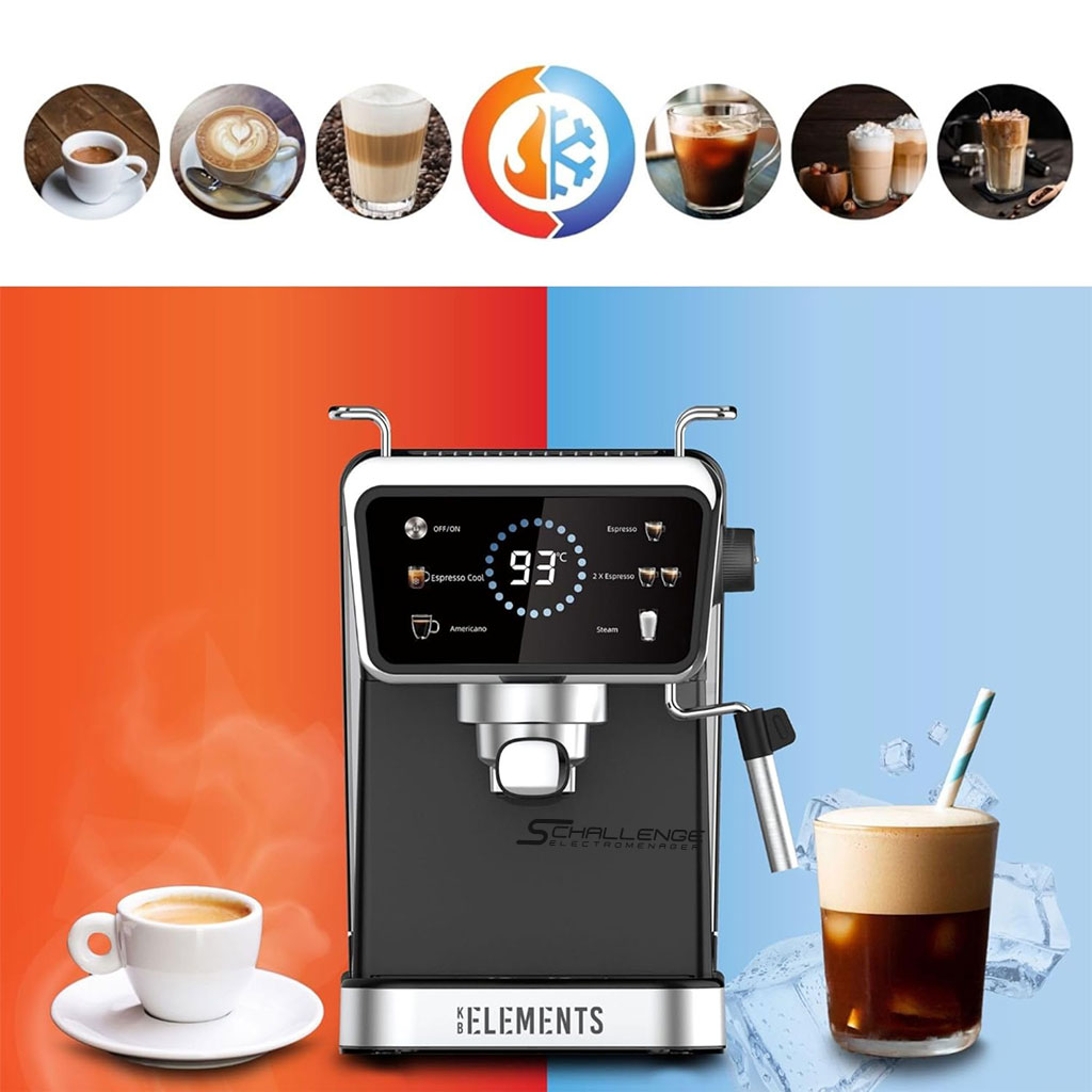 Chaud ou froid : fonction polyvalente café chaud et froid20 bars haute pression : extraction haute pression de 20 bars pour un goût intense et une crème parfaiteFonction vapeur puissante : fonction vapeur pour chauffer ou faire mousser le laitTEMPÉRATURES PRÉCISES ET STABLES : double système de contrôle de la température NTC et PID pour des températures précises et stablesUTILISATION INTUITIVE : grand écran tactile numérique pour une utilisation intuitiveFabricant avec siège d’entreprise et service client en Allemagne – En tant que fabricant basé en Allemagne, nous vous proposons non seulement des produits de qualité supérieure, mais aussi un service client rapide et fiable. Profitez de notre expertise locale et d’un interlocuteur direct pour toutes vos questions et préoccupations.Puissance : 1350 WTension : 220–240 V ~ 50 HzPompe : JIAYIN 20 barsMatériaux : Acier inoxydable + plastique noirPanneau : Écran coloré avec 5 fonctionsSystème : ThermoblockRéservoir d’eau : 1,5 L transparentContrôle : Électronique avec grand écran tactile