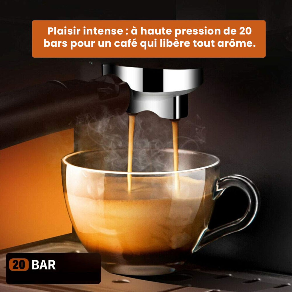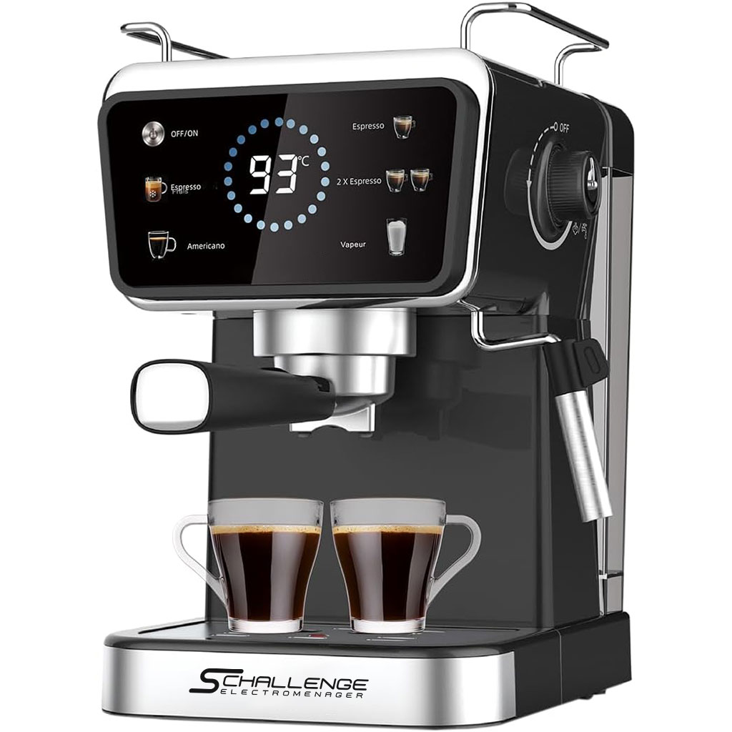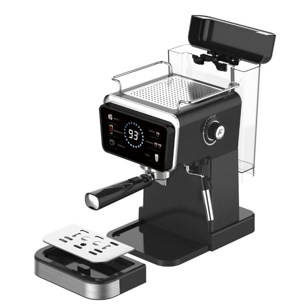 Chaud ou froid : fonction polyvalente café chaud et froid20 bars haute pression : extraction haute pression de 20 bars pour un goût intense et une crème parfaiteFonction vapeur puissante : fonction vapeur pour chauffer ou faire mousser le laitTEMPÉRATURES PRÉCISES ET STABLES : double système de contrôle de la température NTC et PID pour des températures précises et stablesUTILISATION INTUITIVE : grand écran tactile numérique pour une utilisation intuitiveFabricant avec siège d’entreprise et service client en Allemagne – En tant que fabricant basé en Allemagne, nous vous proposons non seulement des produits de qualité supérieure, mais aussi un service client rapide et fiable. Profitez de notre expertise locale et d’un interlocuteur direct pour toutes vos questions et préoccupations.Puissance : 1350 WTension : 220–240 V ~ 50 HzPompe : JIAYIN 20 barsMatériaux : Acier inoxydable + plastique noirPanneau : Écran coloré avec 5 fonctionsSystème : ThermoblockRéservoir d’eau : 1,5 L transparentContrôle : Électronique avec grand écran tactile