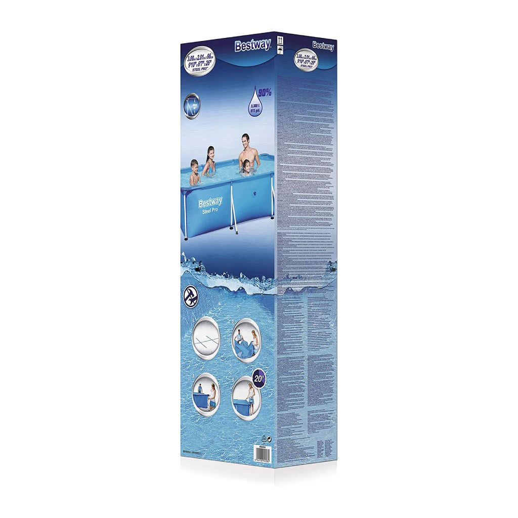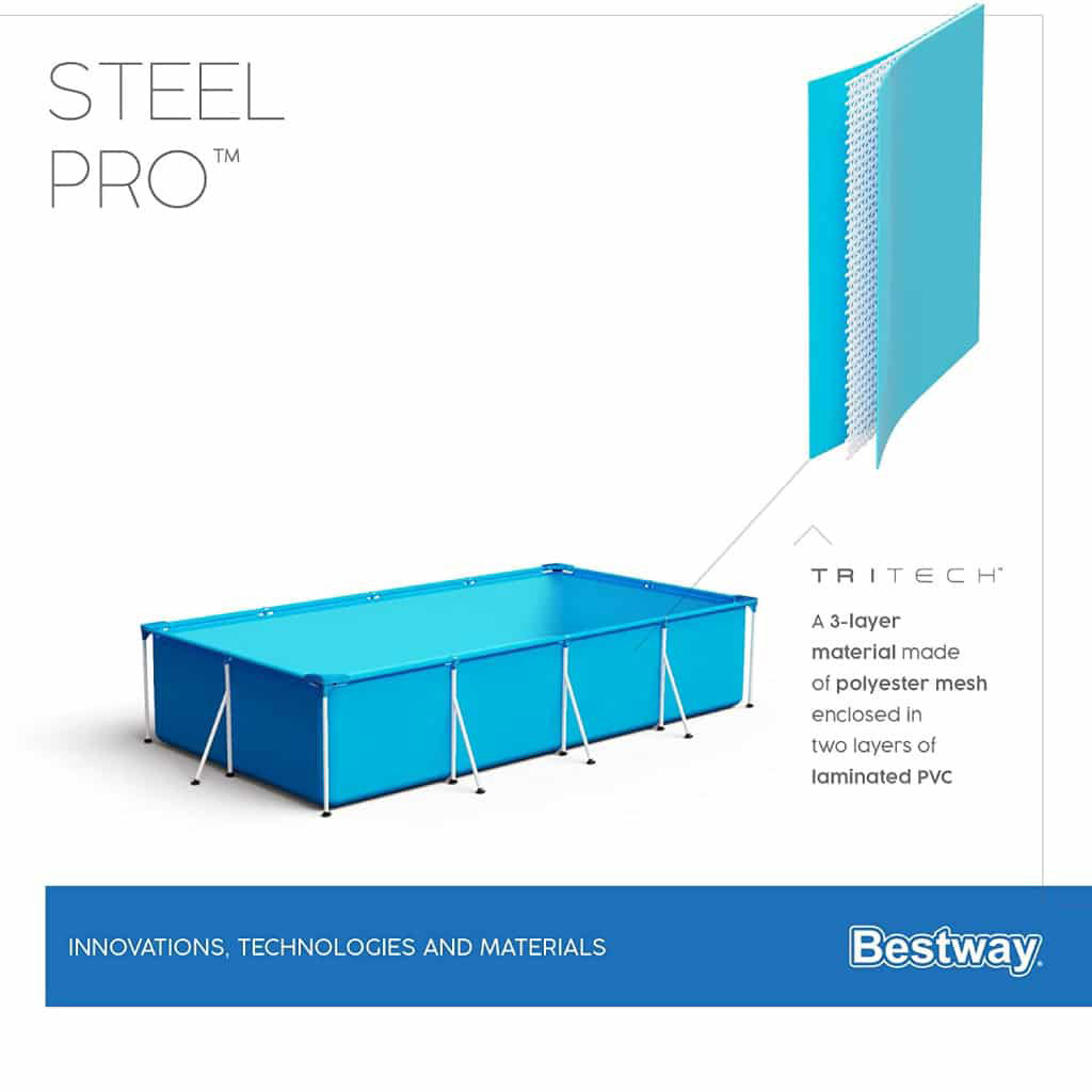 Fabriqué en matériau de haute qualité, solide et durable.Fabriqué avec deux couches de PVC recouvertes d’un tissu polyester épais.Facile à installer, le cadre métallique robuste offre une stabilité parfaite à la piscine.Capacité de la piscine pleine à 90 % : 3300 litres.Dimensions : 300 x 201 x 66 cm.Poids : 18 kg.