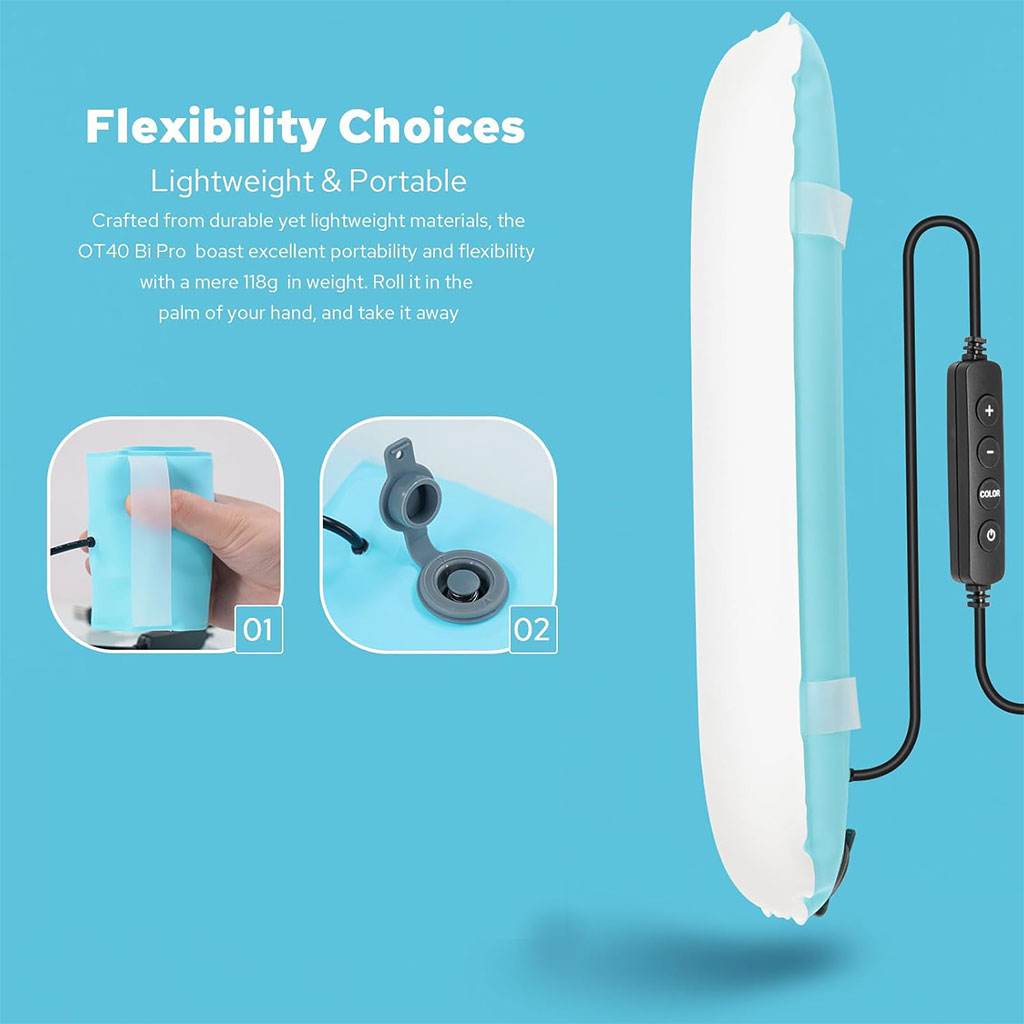 【Léger et portable】 Fabriquée à partir de matériaux doux et durables mais légers, la barre lumineuse vidéo gonflable ZENIKO OT40Bi Pro peut être enroulée et placée dans un petit espace de rangement, et l’emporter très facilement comme lampe de poche quotidienne.【Lampe vidéo LED professionnelle】 Dotée de 90 LED de haute qualité avec bicolore de 3000K à 6500K, d’une puissance de sortie réelle de 7Ws, d’une luminosité élevée jusqu’à 992lux, CRI 96+, TLCI 98+, la lampe à tube à air ZENIKO OT40Bi Pro garantit une superbe expérience d’éclairage pour tous les créateurs.✪ Facile à alimenter et polyvalent ✪ : Grâce à son câble de charge USB, le tube lumineux ZENIKO OT40Bi Pro peut être connecté à une batterie externe (adaptateur USB-C fourni) ou à une prise USB pour une alimentation secteur. Convient pour la photographie, le tournage, le vlogging, le streaming en direct, le camping et autres activités en intérieur ou en extérieur.【Reconnaissance de l’alimentation】 La version Pro de la lampe à tube d’air ZENIKO met à niveau la reconnaissance de l’alimentation lorsque l’alimentation est coupée puis reconnectée, elle s’allume directement à la puissance et à la température précédentes. [Remarque] : lorsque la lumière ne peut pas être allumée avec le dernier réglage en raison d’une alimentation électrique insuffisante, appuyez trois fois sur le bouton d’alimentation (n’appuyez pas en continu), elle démarrera à la luminosité la plus basse et à la dernière température de couleur enregistrée.