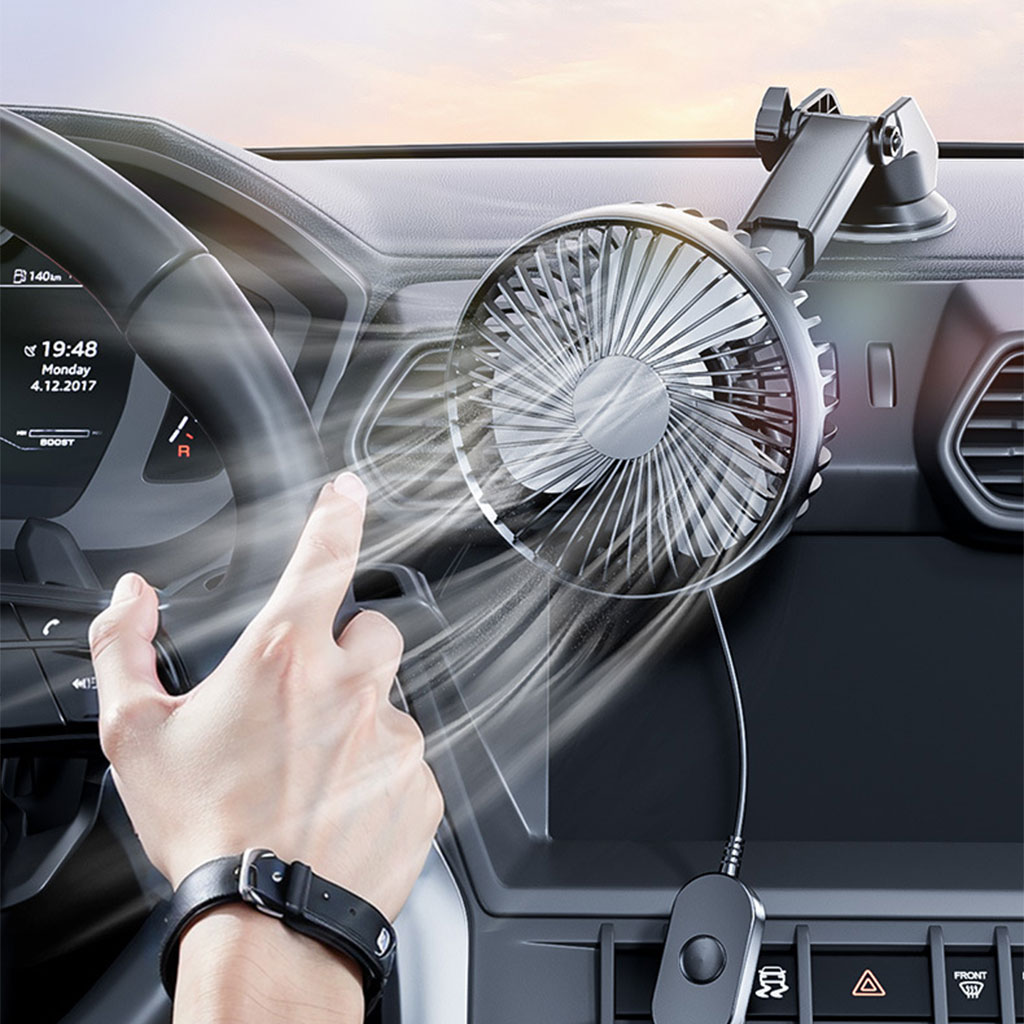 Rotation à 360° : Orientation ajustable pour un flux d’air optimal.Ventouse puissante : Fixation stable, même sur routes cahoteuses.Silencieux et efficace : Ventilation douce sans bruit gênant.Alimentation USB : Compatible avec tous les ports voiture.Design compact : Ne bloque pas la visibilité du conducteur.Idéal pour l’été : Rafraîchit rapidement l’intérieur du véhicule.